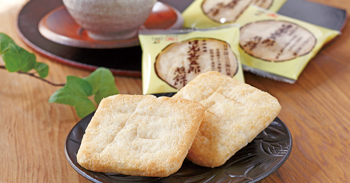 ソフトな塩味とバターの風味が絶妙な欧風煎餅が自慢。米のうま味を引き出す独特の焼き上がりを楽しみたい。