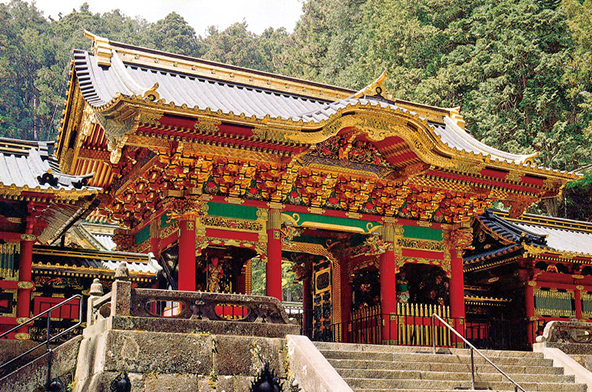 徳川三代将軍・家光の廟所(びょうしょ)。祖父の家康をしのいではならないという遺言にならい、彫刻や彩色はやや控え、金と黒を使用した重厚な造り。